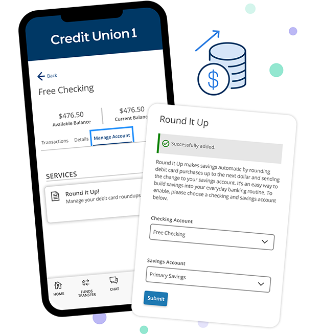 Round It Up makes savings automatic by rounding debit card purchases up to the next dollar and sending the change to your savings. It’s an easy way to build saving into your everyday banking routine. You can easily turn on Round It Up directly in Digital Banking.